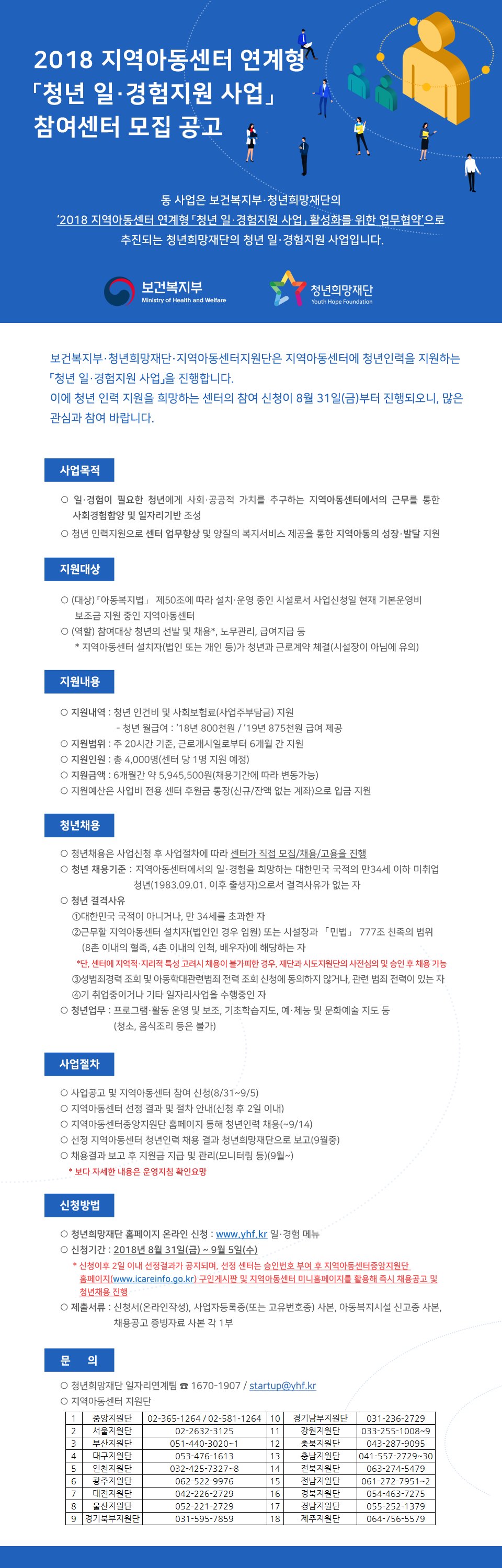 [보건복지부, 청년희망재단, 지역아동센터지원단] 2018 지역아동센터 연계형 「청년 일․경험지원 사업」 참여센터 모집 공고